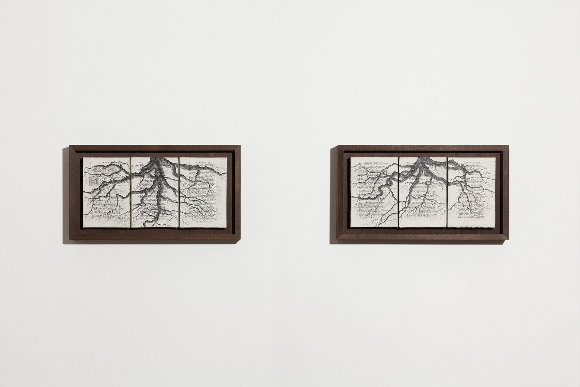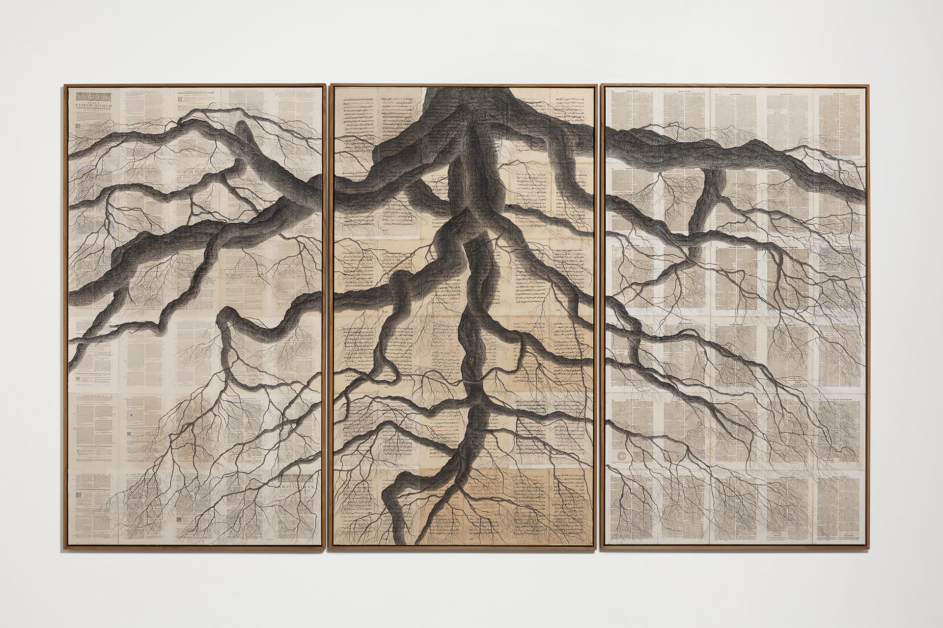 Exécutées sur les pages de vieux manuscrits ou d’anciennes éditions de livres rares, ces racines fantastiques, qu’il dessine avec une maîtrise réaliste saisissante, prennent une valeur symbolique jouant sur la polysémie du terme : les racines des arbres représentent nos racines culturelles, questionnent notre identité intellectuelle tout en proposant une esthétique épurée, essentielle, qui rappelle en bien des endroits l’art asiatique mais aussi l’arte povera italienne.