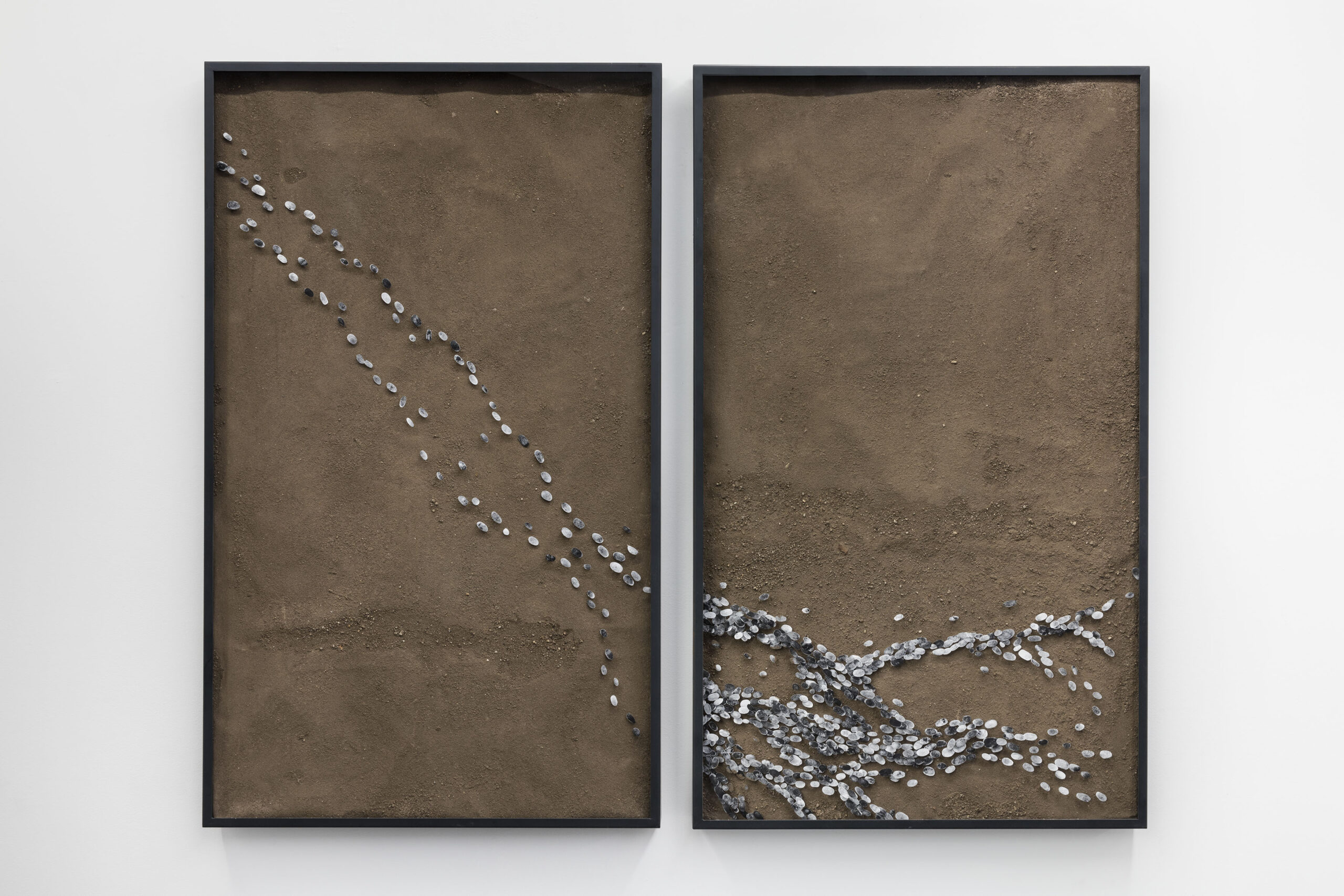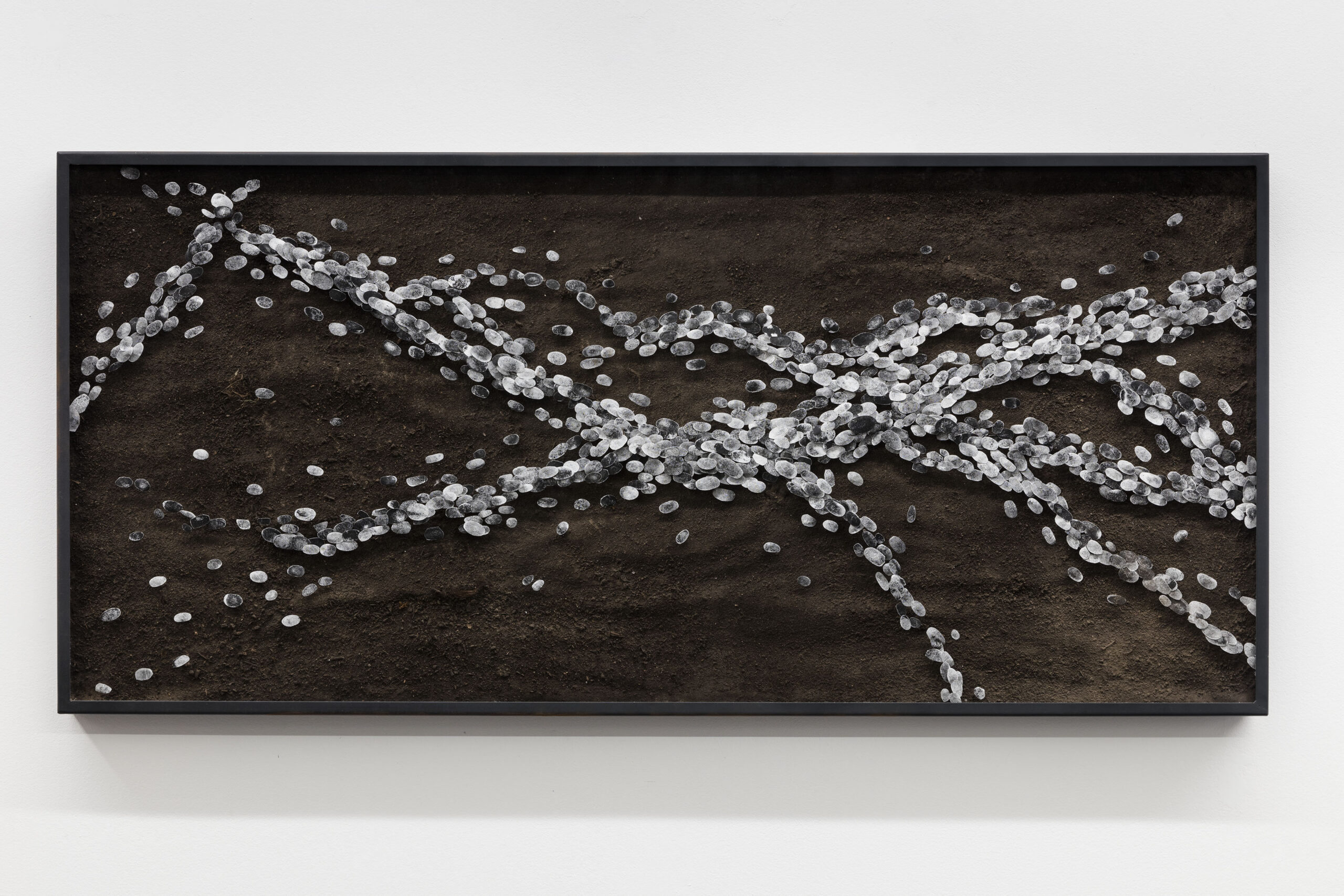 Ce sont des œuvres issues de la patience et du travail méticuleux de l’artiste, d’ordre presque scientifique. Savamment, il place les empreintes à différentes hauteurs et selon des nuances infimes allant du gris clair au noir le plus foncé afin de conférer une impression de relief saisissante à ces armures d’écailles sur fond blanc.